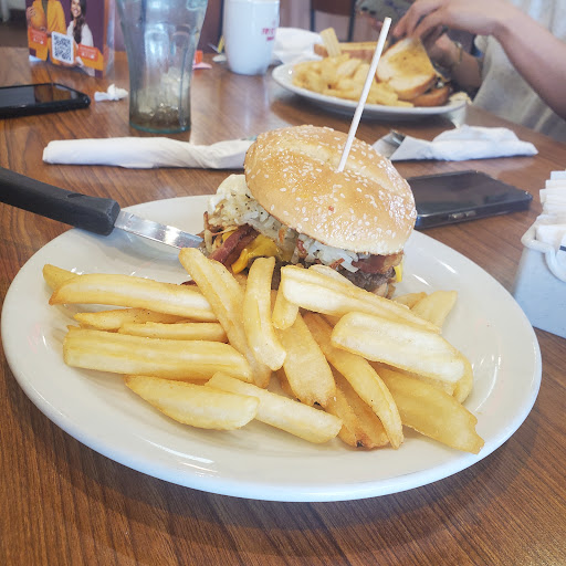 2024-04-29 03:12:25I placed an order at 6:56pm and for it to be picked up by 7:30pm. On the app it said that it was ready. I live next to this dennys, literally 3 mins away.I get there at 7:32 and they said itโs not ready. No worries. They said 3 more mins but ended up being 16 mins.The cook left my food on the counter, then the waitress came like in 2 mins. She was nice and notice it had onions which I donโt like. I appreciate her for that. I got home, and the fries were not fresh.Wish I checked them before I left. It was not busy at all, maybe like 3 families. I rather go to the Dennys near the AV Mall. Their food is fresh and hot :)The burger was good tho!
