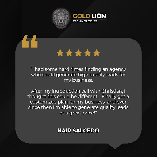 2022-03-19 18:49:46It was an amazing experience working with Gold Lion Tech!Christian and his team helped me through the whole process of building landing pages and funnels for my business and generating traffic throughsocial media.I am very pleased with my results, can only recommend.