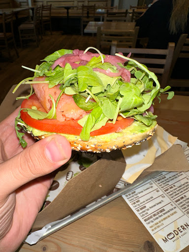 2024-03-10 16:30:32So, I made a pit stop at Modern Bakery on my way back from LA to satisfy my bagel craving, and let’s just say it was a bit of a mixed bag.Located in the Westerfield shopping center, parking was a bit of a hassle, but I pushed through in the hopes of a delicious bagel experience. Stepping inside, I was greeted by a tempting display of baked treats – from chocolate chip cookies to cinnamon buns, they had it all. The bagel display on the back wall caught my eye, and I was eager to dive in.The staff was friendly and knowledgeable as I placed my order for a plain bagel with cream cheese, tomatoes, and lox. However, I was a bit disappointed when my bagel arrived untoasted – it wasn’t suggested, nor did I think to ask. Nevertheless, the bagel itself was fantastic – flavorful and with a satisfying depth. The generous amount of cream cheese, lox, and tomatoes made it a hearty and enjoyable meal.Moving on to the seating area, it had a cozy vibe with wood tones that added to the ambiance. However, I couldn’t help but notice the dirty floor – crumbs from the day before were visible and felt underfoot, which was a bit off-putting. It definitely needed a good sweep and clean-up.Service-wise, I found it to be on the slower side, especially considering I was the only customer there. It took longer than expected to get a bagel, which was a bit frustrating.Overall, while the bagel itself was delicious, the cleanliness of the establishment and the slower service left me feeling hesitant to return. Here’s hoping for a cleaner and faster experience next time!