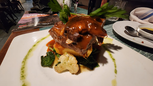2024-05-20 21:13:16Forgot to ask for our waitress name but the receipt says dulce. she was great! took the time to explain to us what dishes were and the house special that day. the food was GREAT. i got the most expensive thing; the steak ofc. the potato was flavored SO GOOD. i liked everything on the dish besides the pine. i did not like that flavoring. but everything on that dish was delicious. the meat was perfect, not too salty but paired with the potato was really tasty. my partner got the chicken alfredo, it was sweet but i preferred my steak. pretty fancy restaurant. we went on a whim so we weren’t dressed that well lol we were treated great! the only let down was the water being flavored by tap flavoring.
